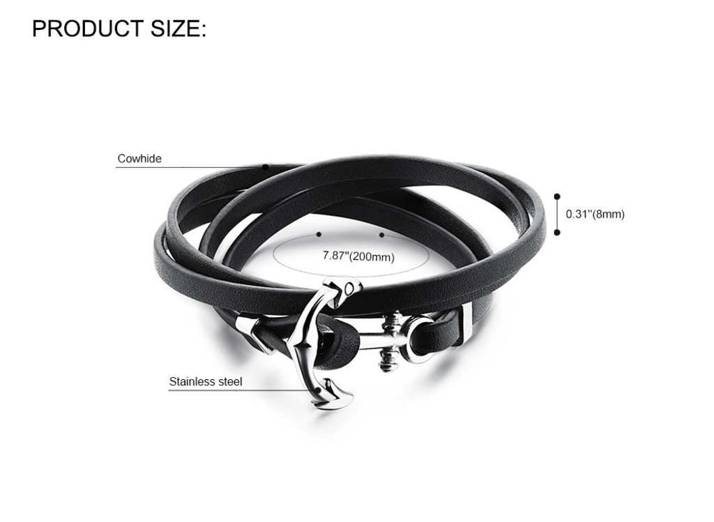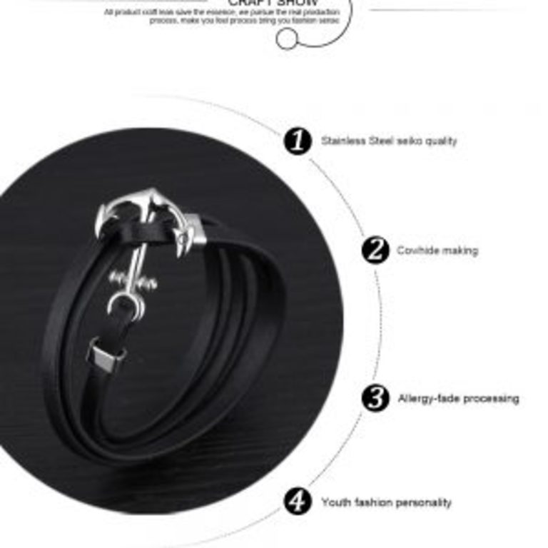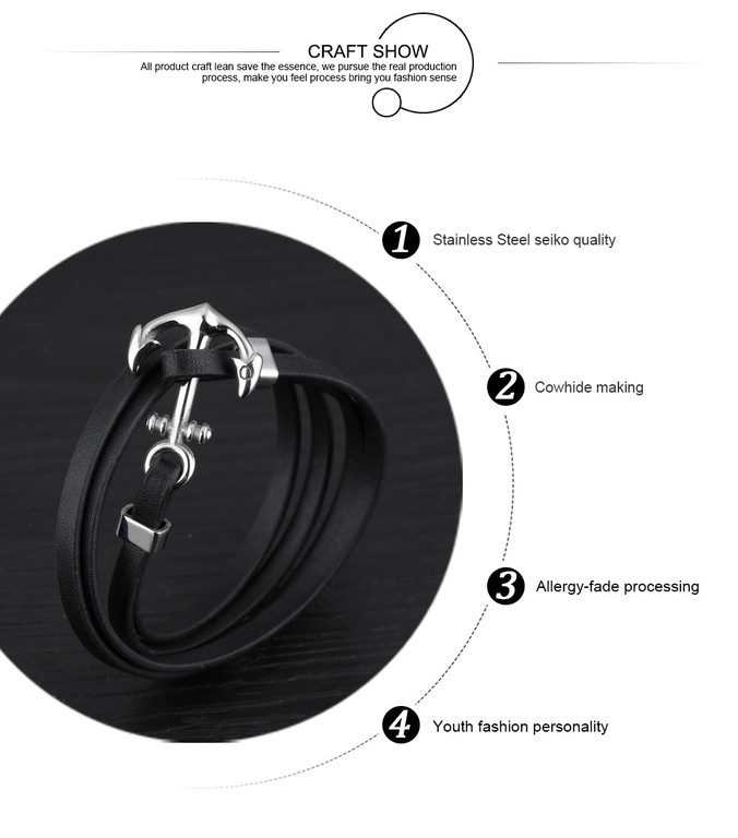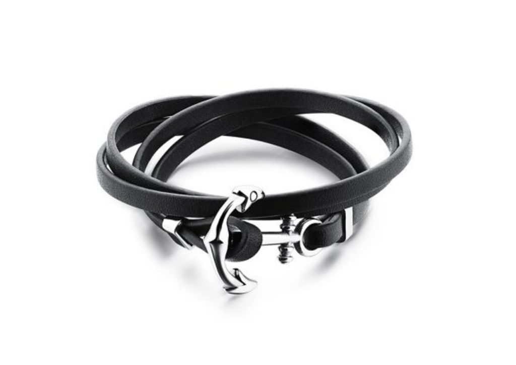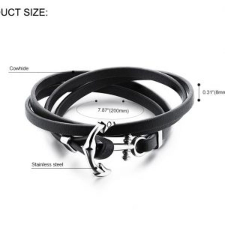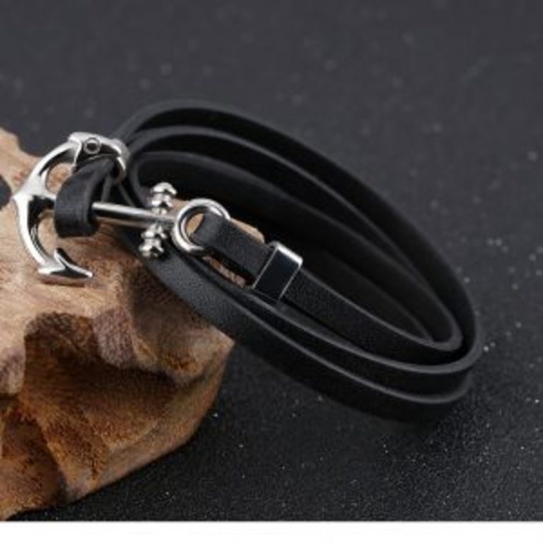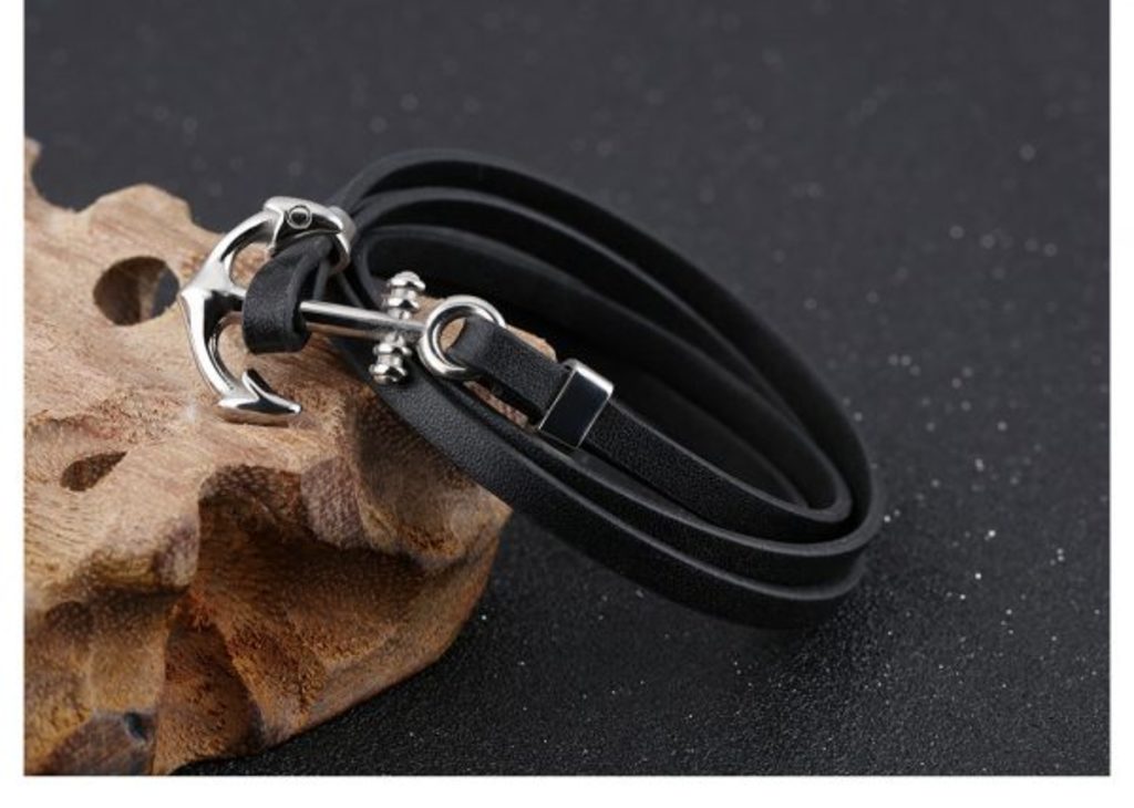 צמיד מעור שחור עם עוגן מפלדת אל חלד