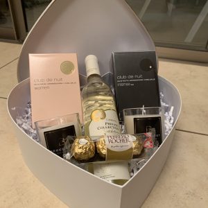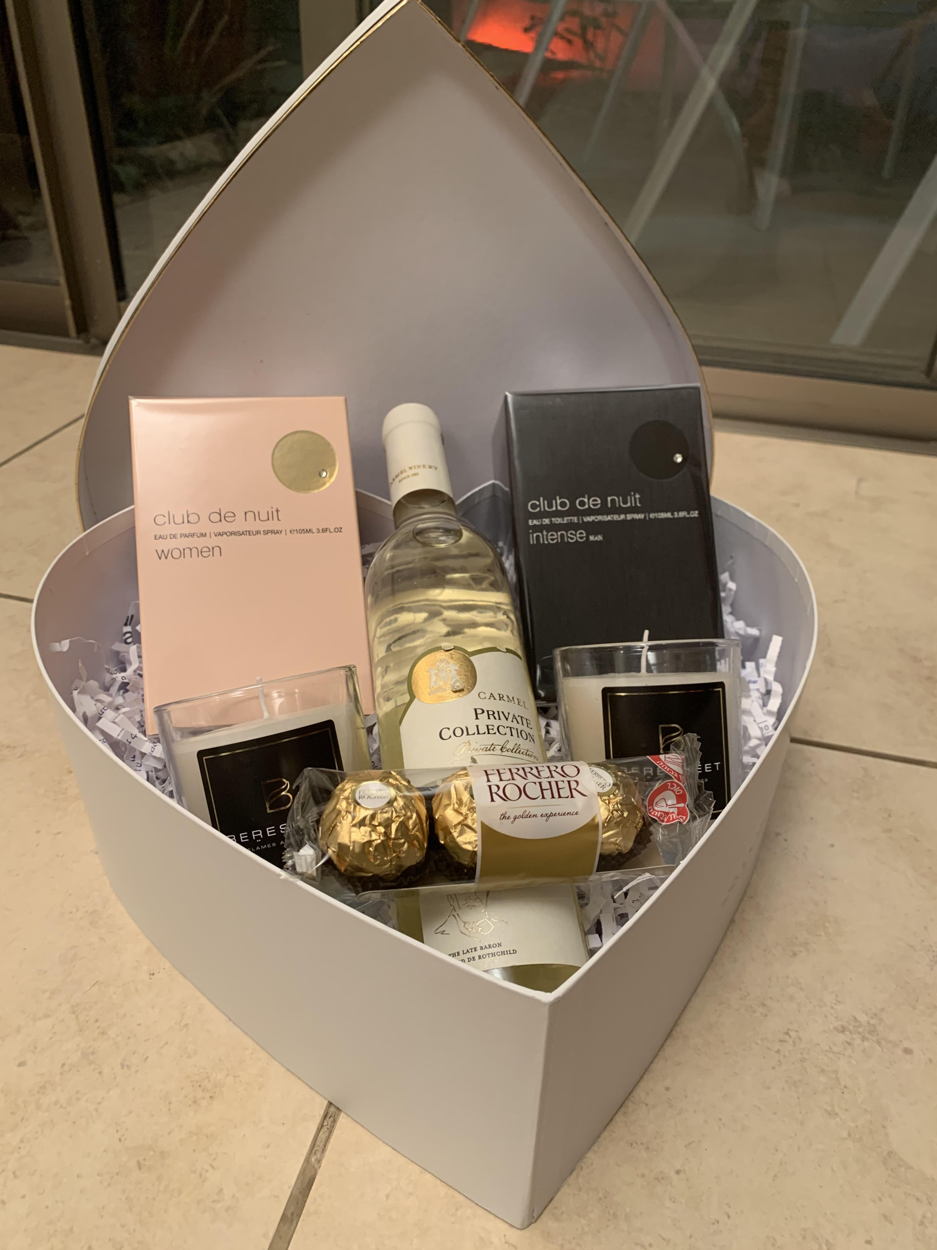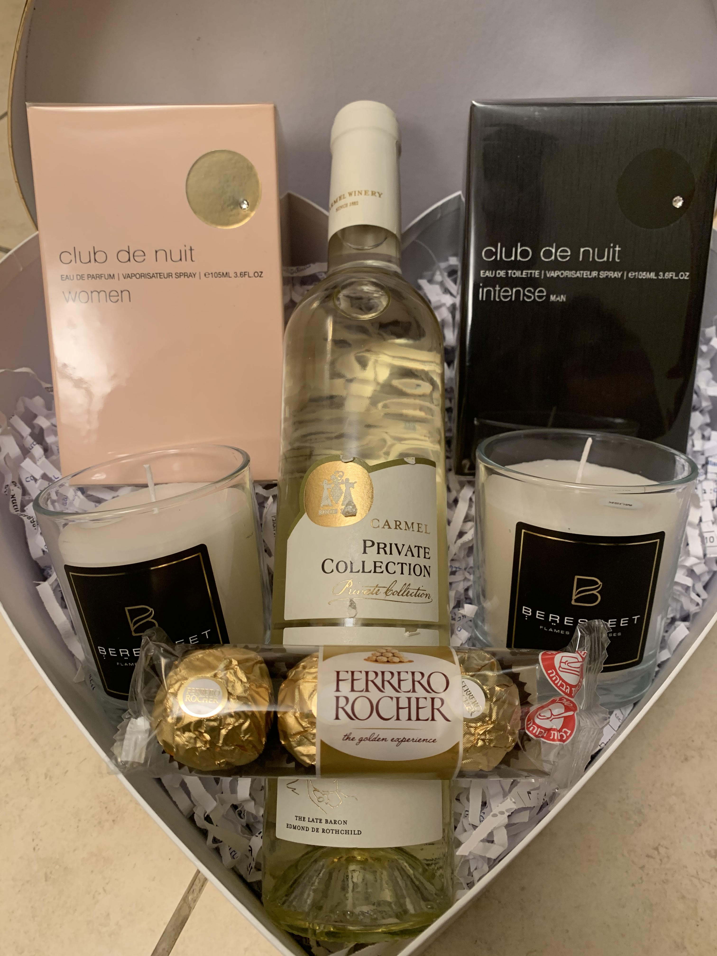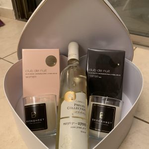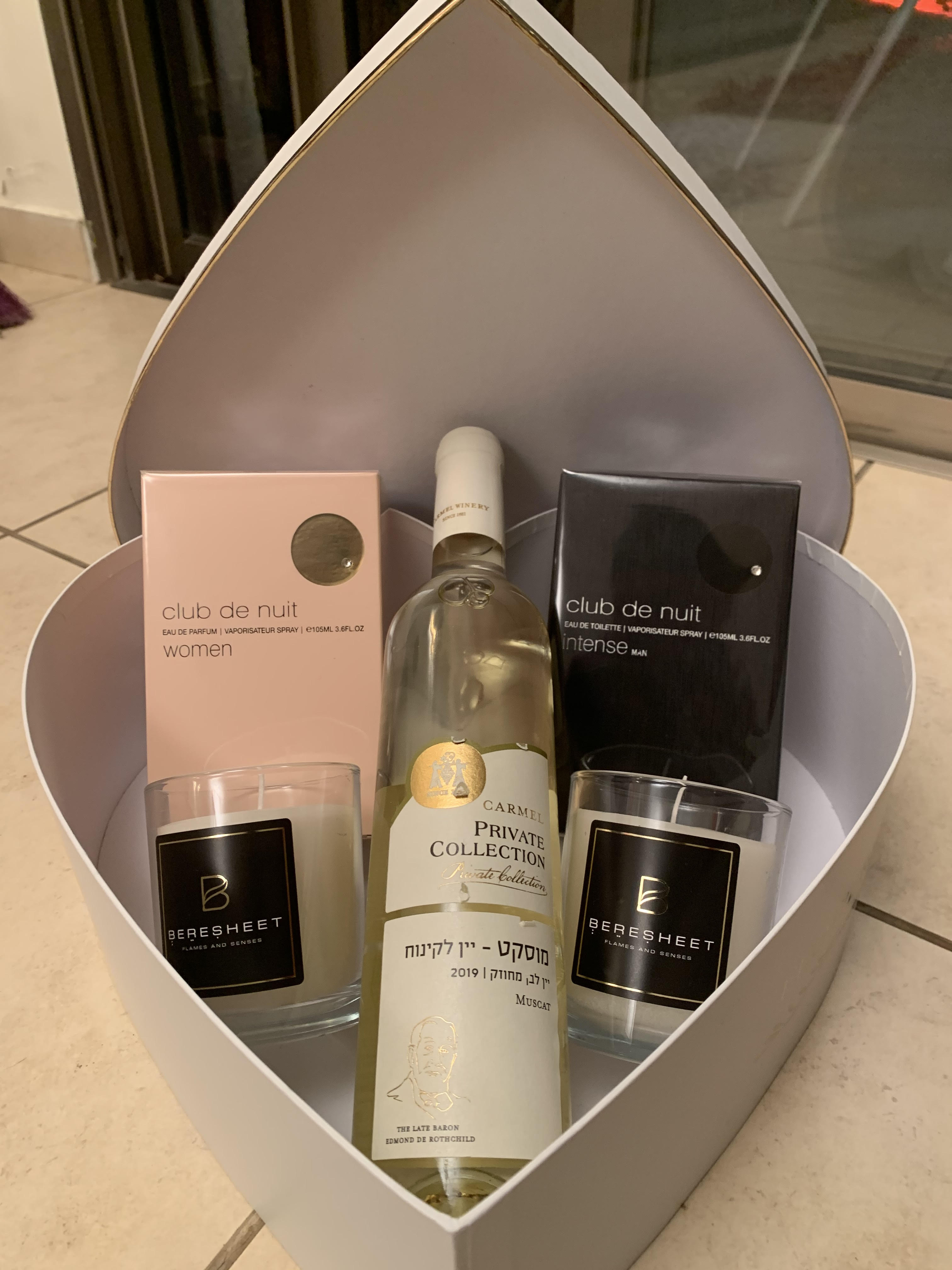 המארז מכיל סט של 2 בשמים אחד לגבר ואחד לאישה, יין לבן ושני נרות אווירה ריחניים בניחוח מיוחד ונעים