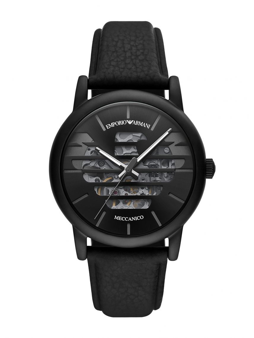 שעון ארמני לגבר עם רצועת עור שחורה מנגנון אוטומטי