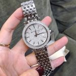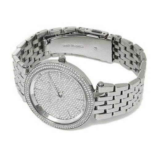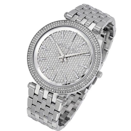 רצועת מתכת אל חלד כסופה והטבעת של השעון והלוח משובצים זירקונים השעון כולל זכוכית קריסטל ומחוגים כסופים