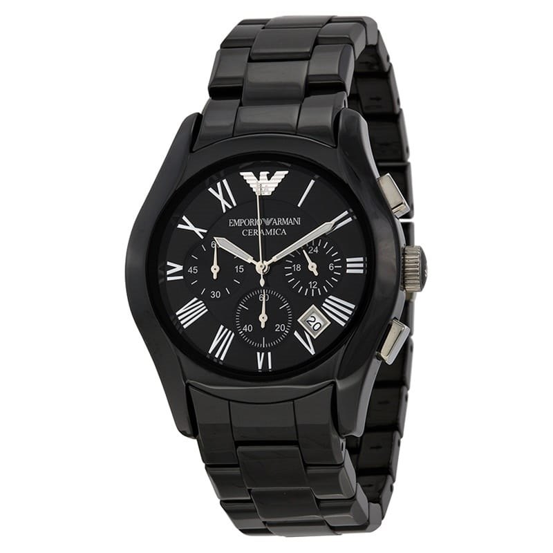 שעון פלדת אל חלד מושחרת בשילוב קרמיקה בעל לוח שעון שחור עם אותיות רומיות תאריכון וזכוכית מינרל חזקה ועמידה נגד שריטות