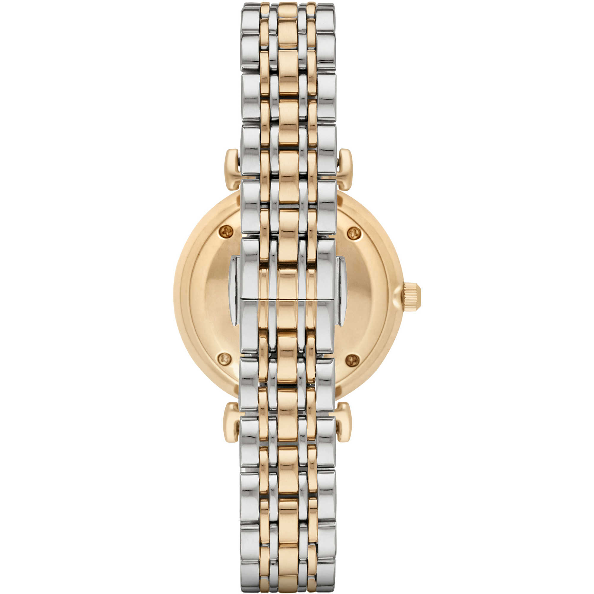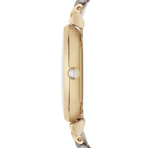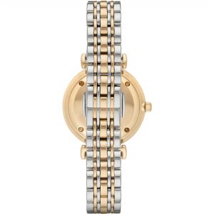 שעון ארמני לאישה גוף השעון עשוי פלדת אל חלד בשילוב צבע כסף וזהב לוח השעון משובץ אבני זירקון ואותיות רומיות.