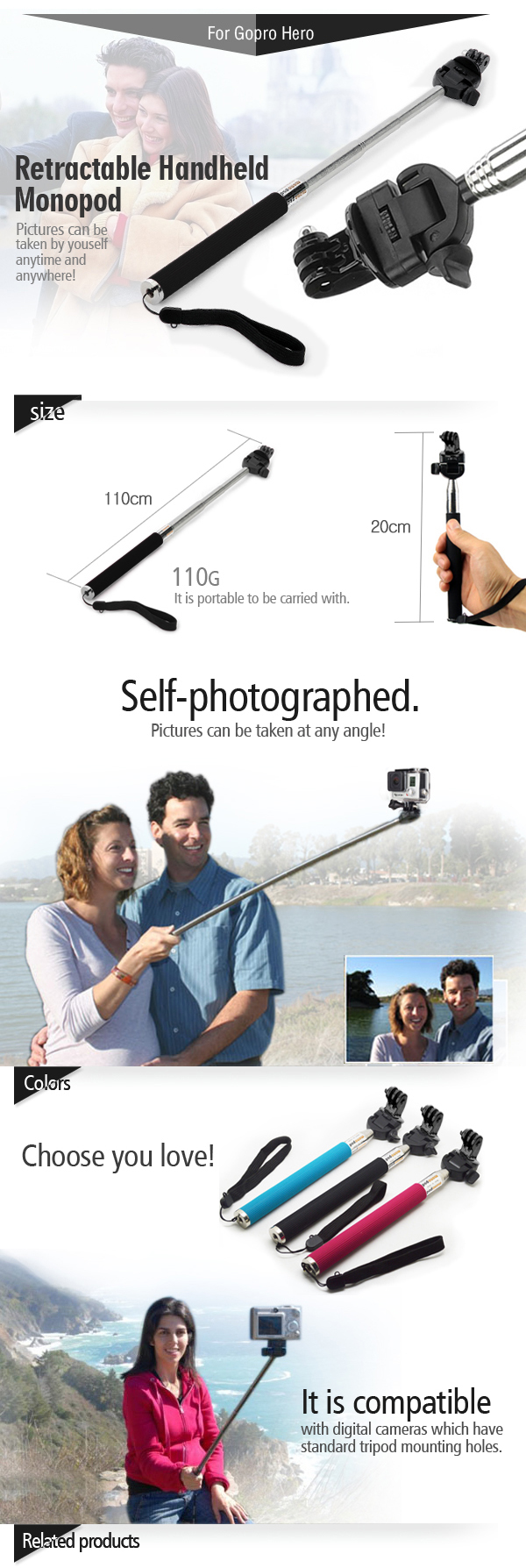 נייד וקל משקל מתאים למצלמות דיגיטליות w / חצובה סטנדרטית מתאים גם לצלם מזווית / למטה למעלה