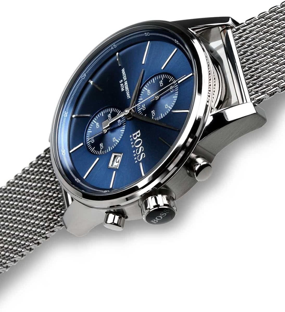 שעון עשוי מפלדת אל חלד כסופה בעל רצועת רשת בסגנון MESH עם לוח שעון בצבע כחול מהמם בעל תאריכון מובנה, אינדקסים עדינים וכסופים וזכוכית קריסטל חזקה ועמידה נגד שריטות