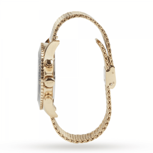 רצועת רשת בסגנון MESH עשויה פלדת אל חלד בצבע זהב לוח השעון שחור בעל אינדקסים זהובים, שעוני משנה וזכוכית קריסטל חזקה ועמידה נגד שריטות