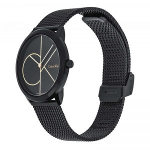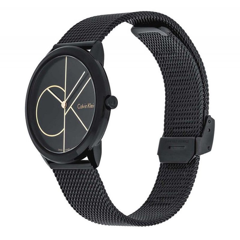 שעון עשוי פלדת אל חלד מושחרת עם רצועת רשת בסגנון MESH לוח השעון הקלאסי עם רקע בצבע שחור וחריטת הלוגו CK בצבע זהב וזכוכית קריסטל חזקה ועמידה