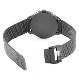 השעון עשוי מפלדת אל חלד בצבע אפור כהה, בעל רצועת רשת בסגנון Mesh ולוח שעון קלאסי בצבע אפור כהה עם חריטת הלוגו CK