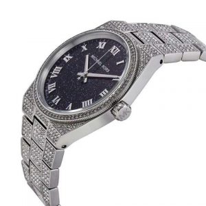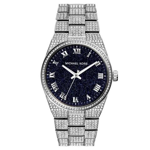 שעון Stainless Steel בצבע כסף משובץ אבני קריסטל לוח השעון כחול בשילוב אותיות רומיות כסופות