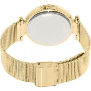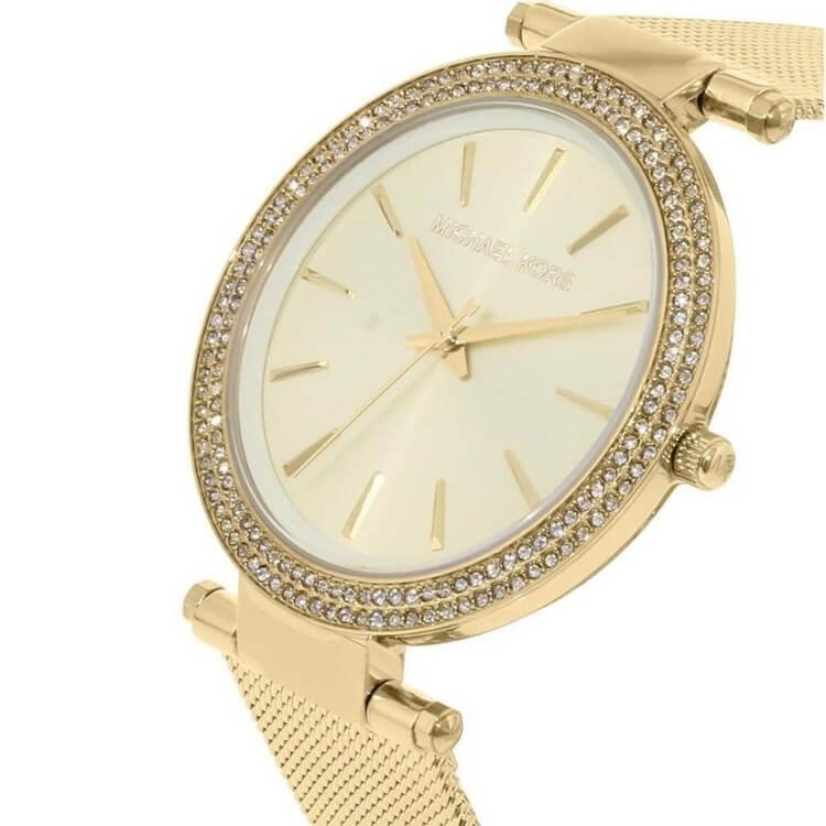 שעון בצבע זהב עם רצועת רשת בסגנון MESH ולוח שעון זהב עם אינדקסים עדינים וזהובים ושיבוץ אבני זירקון בבזל השעון עם זכוכית קריסטל חזקה ועמידה נגד שריטות