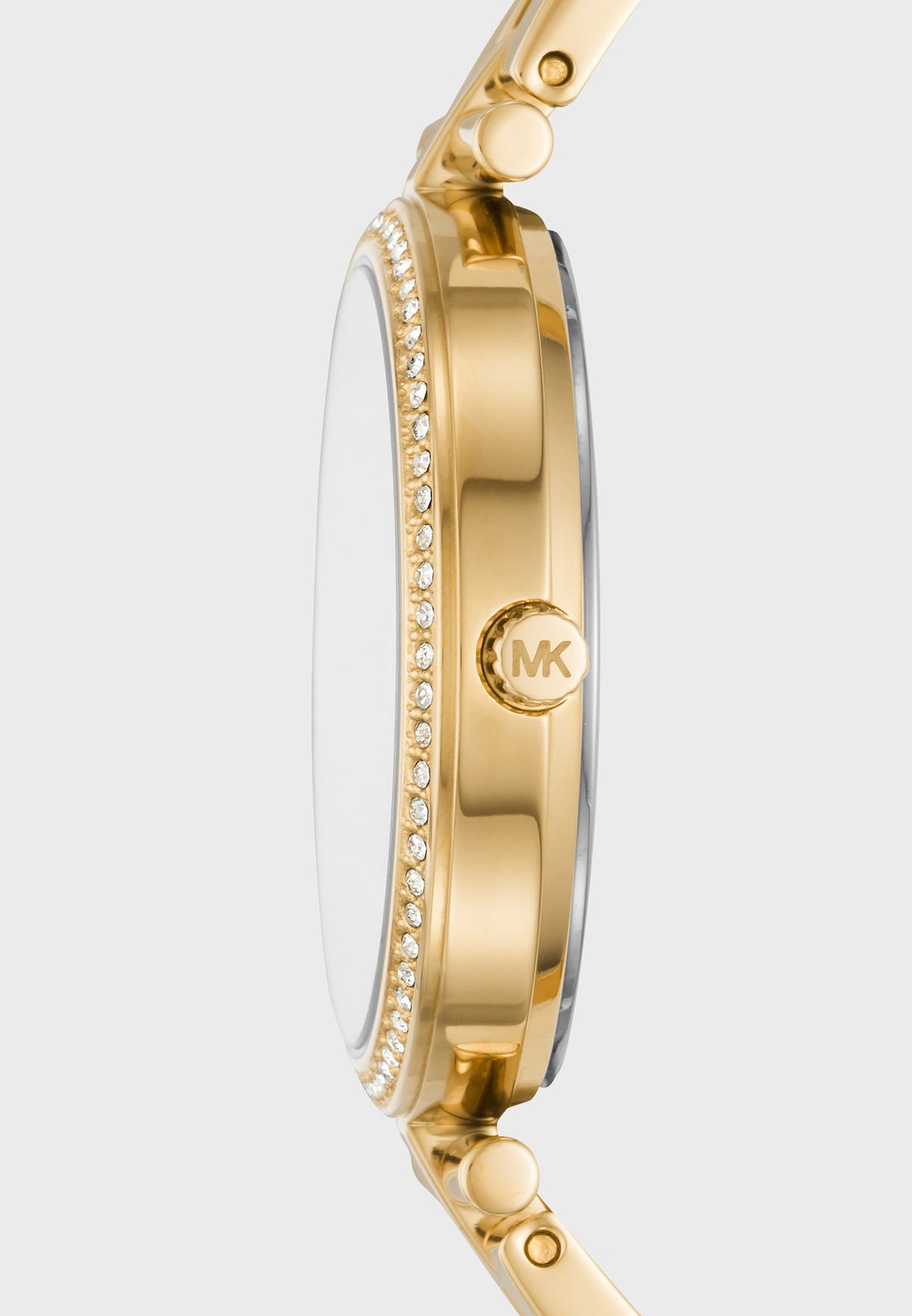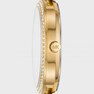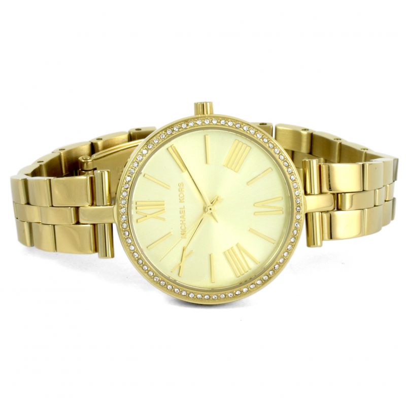 שעון קלאסי ועדין לאישה מבית מייקל קורס שעון זהב עם שיבוץ אבני זירקון בלוח השעון ואותיות רומיות וזכוכית קריסטל חזקה נגד שריטות