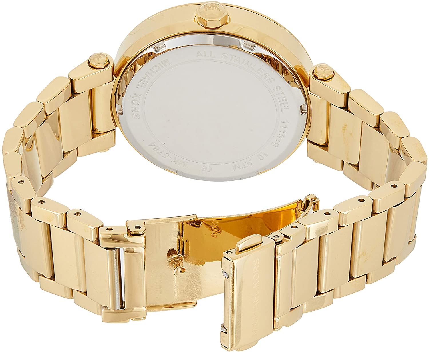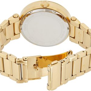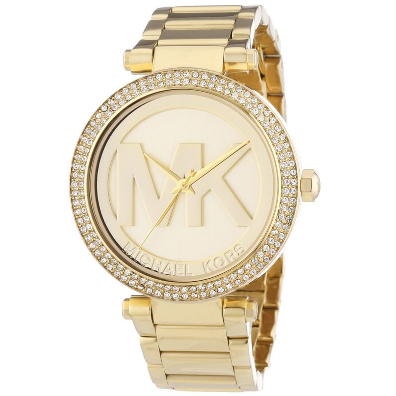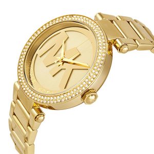 שעון יד אנלוגי לאישה בעל רצועת פלדת אל חלד מחוליות בצבע זהב צהוב, בזל השעון משובץ אבנים בלוח השעון חרוט לוגו המותג MK