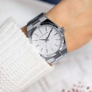 שעון עם עיצוב קלאסי בצבע כסף ולוח שעון כסף משובץ בעל מראה מושך מאוד לאישה שעון קלאסי ומהמם כל מילה מיותרת
