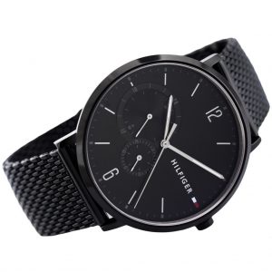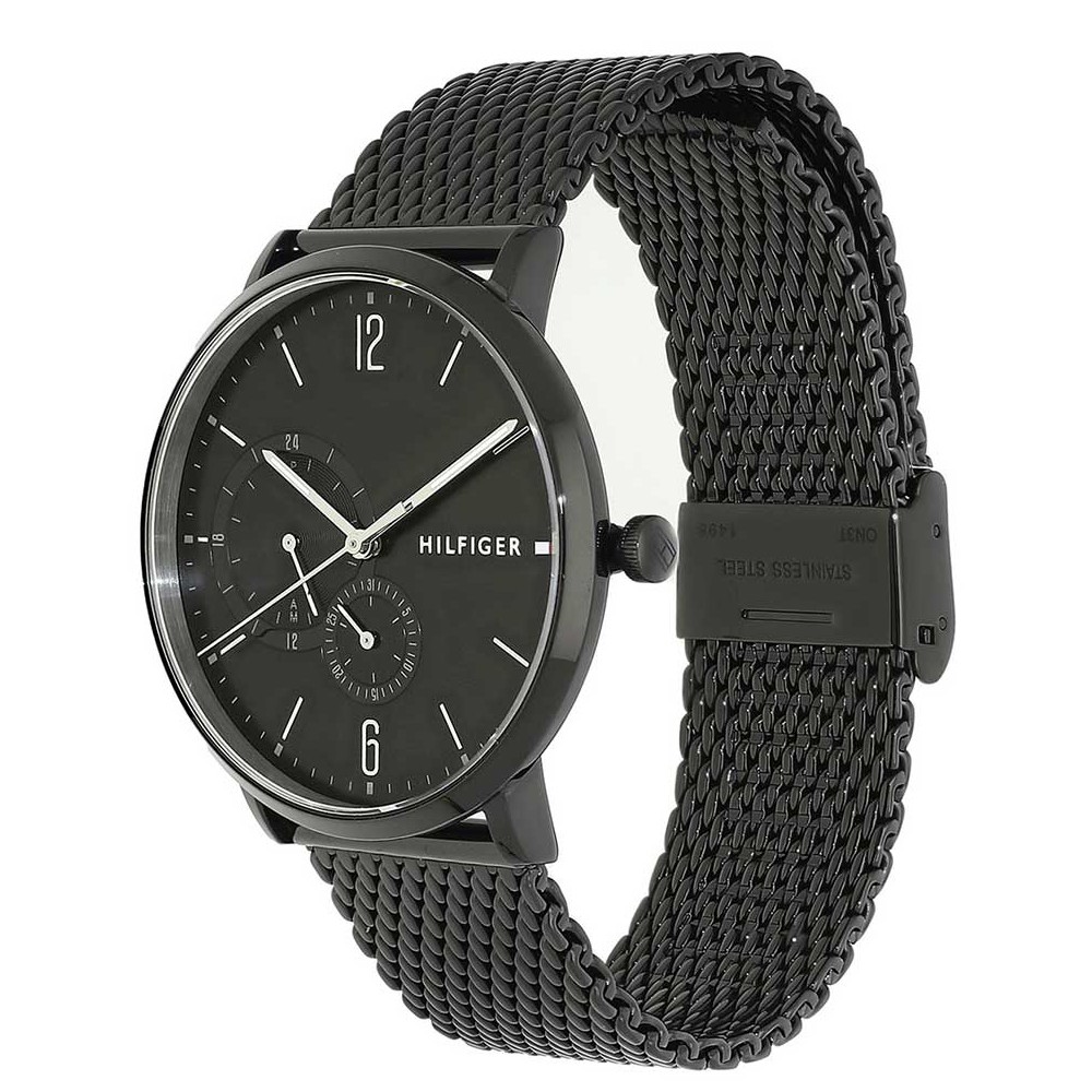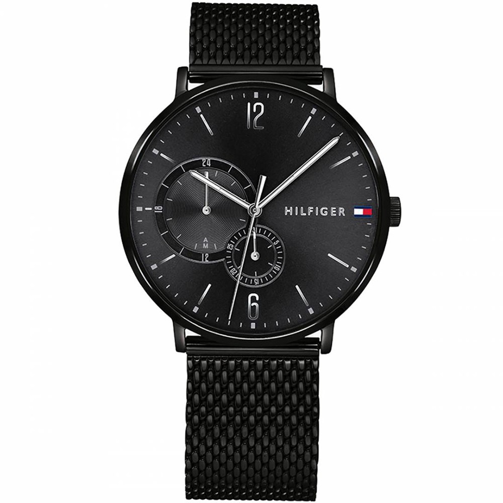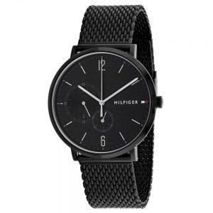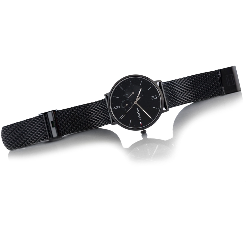 שעון טומי הילפיגר לגבר בעל רצועת MESH שחורה לוח השעון שחור עם סמל של Tommy Hilfiger