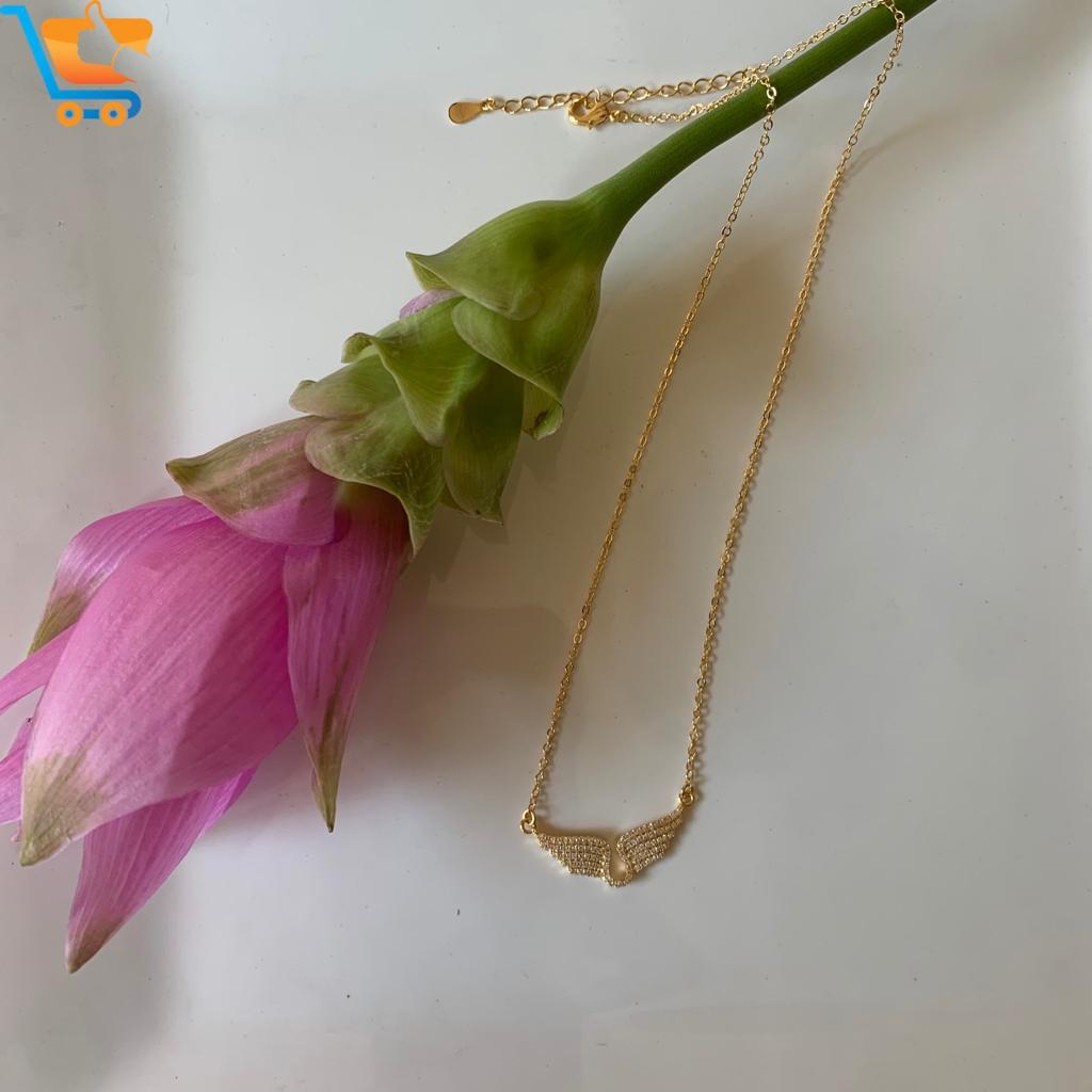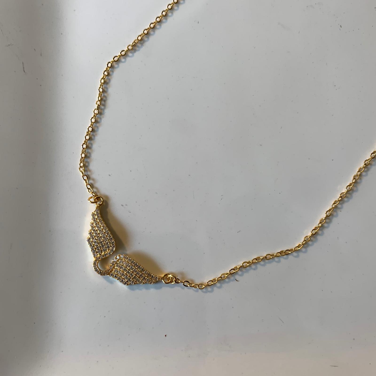 שרשרת עשויה ממתכת פליז בציפוי זהב צהוב בעלת תליון בצורת כנפיי מלאך משובצות אבני זרקון לבנות.